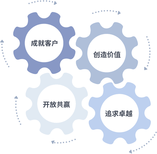 成就客户是一切决策的出发点,,创造价值是衡量所有工作的标准,,追求卓越是我们做事做人的态度,,,,开放共赢是我们的格局也是最终的结果。。价值观的齿轮环环相扣,,,,推动着组织里的每个人不断向前。。。