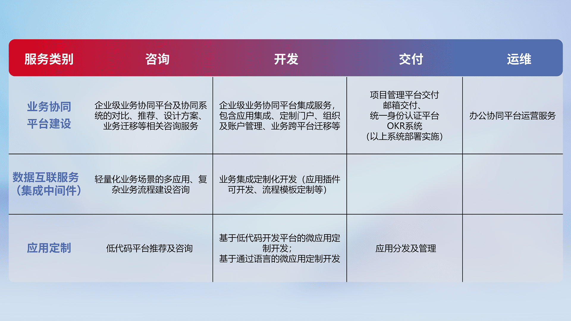 针对钉钉、、、企微、、、IDaas等平台级产品提供产品的规划、、方案、、、、交付、、定制化开发等服务,,,实现如统一协同办公、、智能客户服务、、混合会议管理、、、智能数据查询、、、等业务场景,,,实现数字化转型。。。。